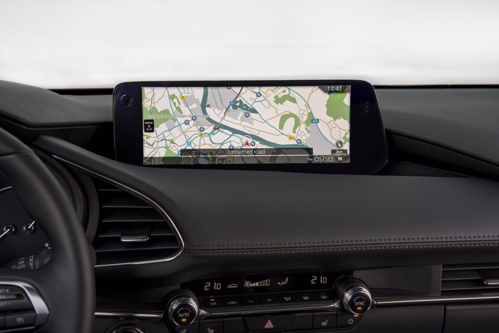 Il sistema di infotainment utilizza uno schermo centrale da 10,25″, non touch nell’interfaccia nativa Mazda. La funzione touch è disponibile solo con Apple CarPlay e Android Auto wireless. La gestione principale avviene tramite rotore sul tunnel centrale, soluzione che privilegia la concentrazione sulla guida.