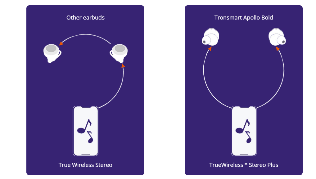 Sono cuffiette True Wireless, quindi a differenza di quelle che non lo sono, la sorgente audio è una sola per entrambe le cuffie. Il funzionamento è semplice, quando si collegano allo smartphone, il flusso audio non fa da ponte da una cuffia ad un altra, ma bensì arriva ad entrambe dallo smartphone permettendo così di utilizzarle separatamente e di non avere nessun ritardo tra una cuffia e l’altra.